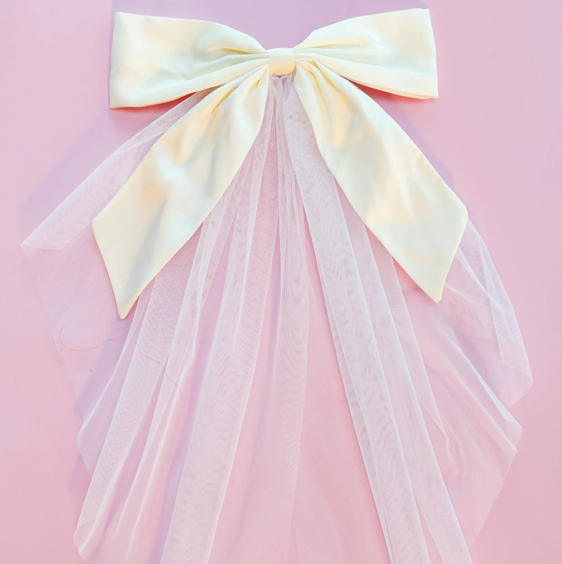 Get ready to turn heads with the OMG Beauty Veil Bow Hair Clip. With a statement satin bow and a delicate tulle veil drop, this clip is perfect for weddings and photos. Its beautiful design will add a touch of elegance to any hairstyle, making you feel confident and glamorous. Step up your hair game with this must-have accessory.